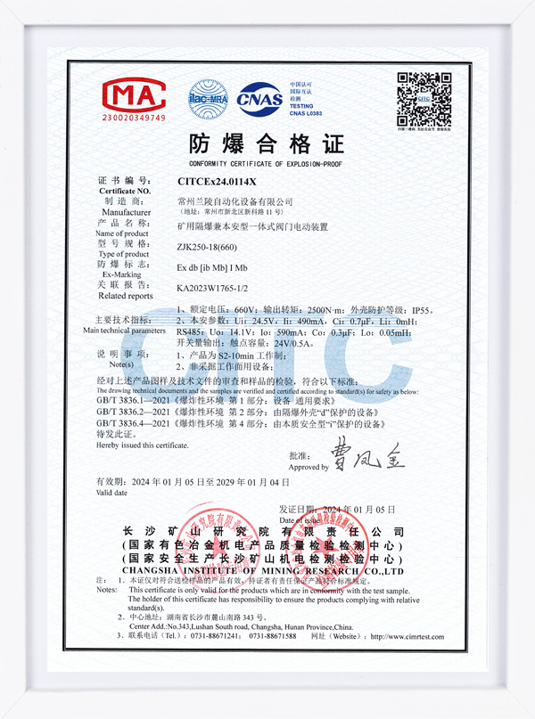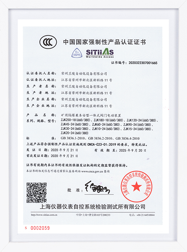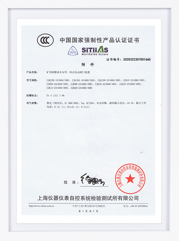 ZJK系列認證證書 礦用隔爆兼本安型一體式閥門電動裝置