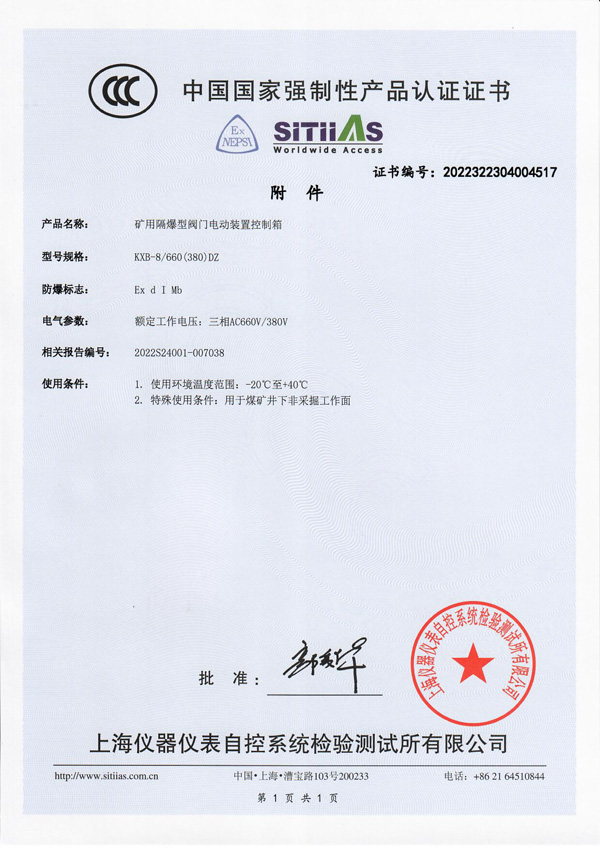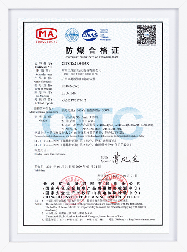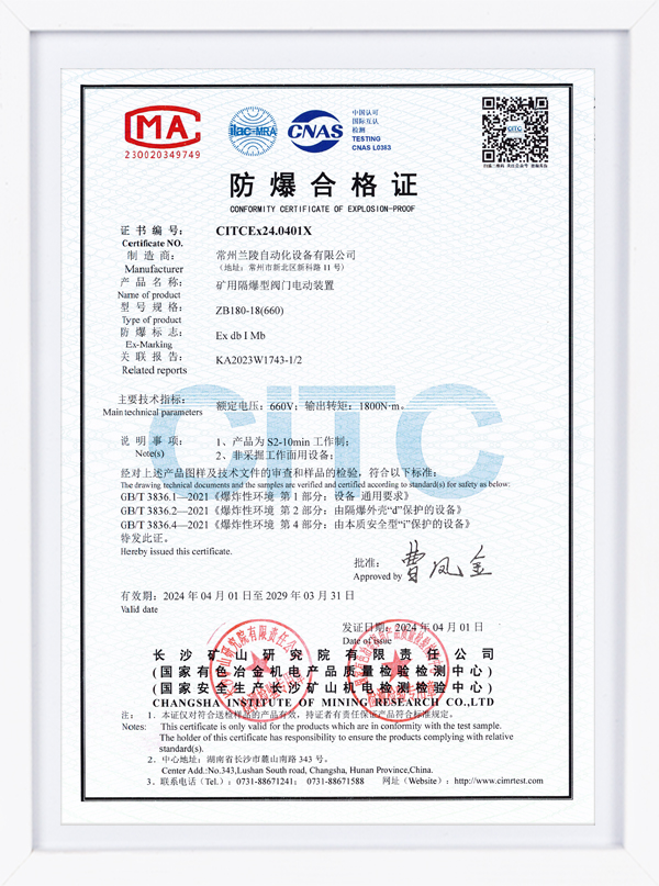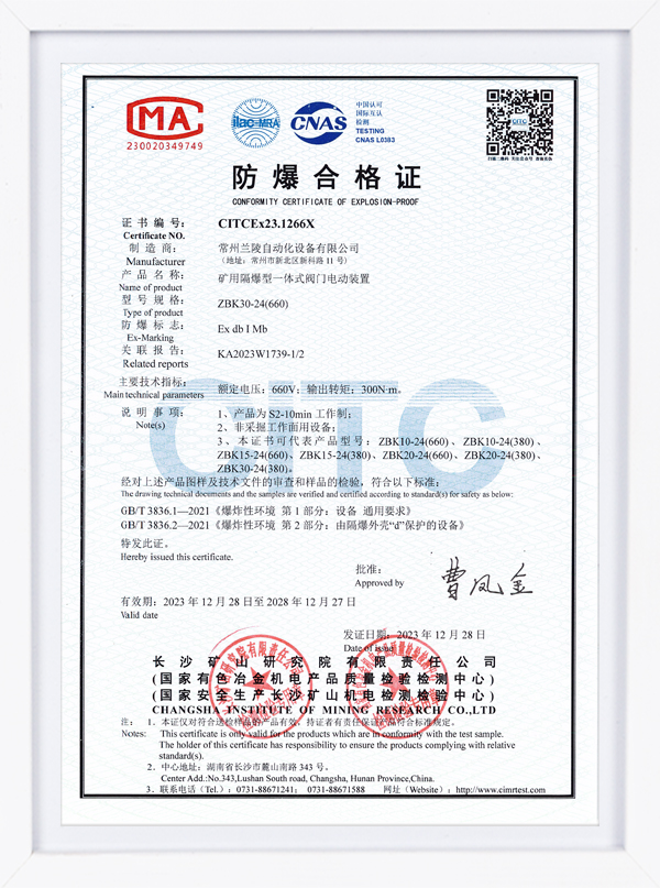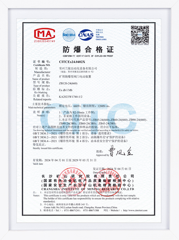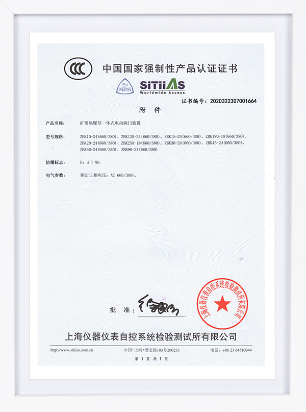 ZBK系列認證證書 礦用隔爆型一體式閥門電動裝置