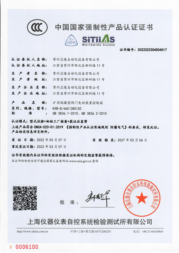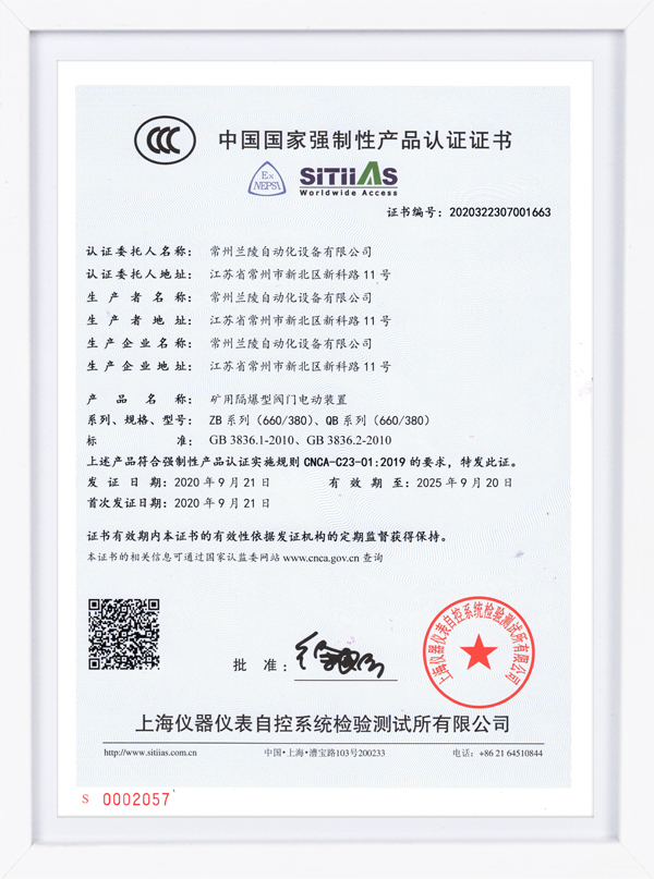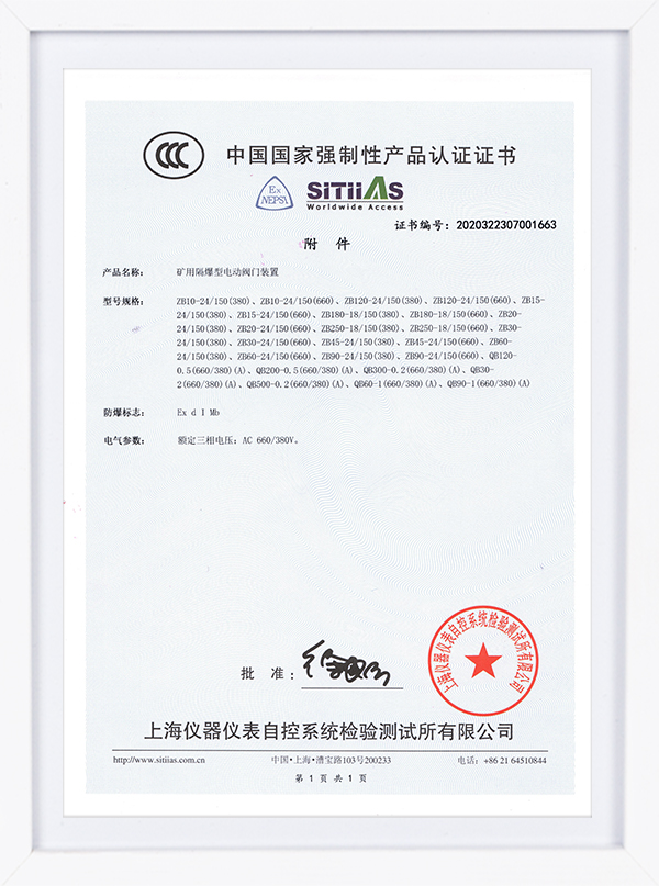 ZB QB系列認證證書 礦用隔爆型閥門電動裝置