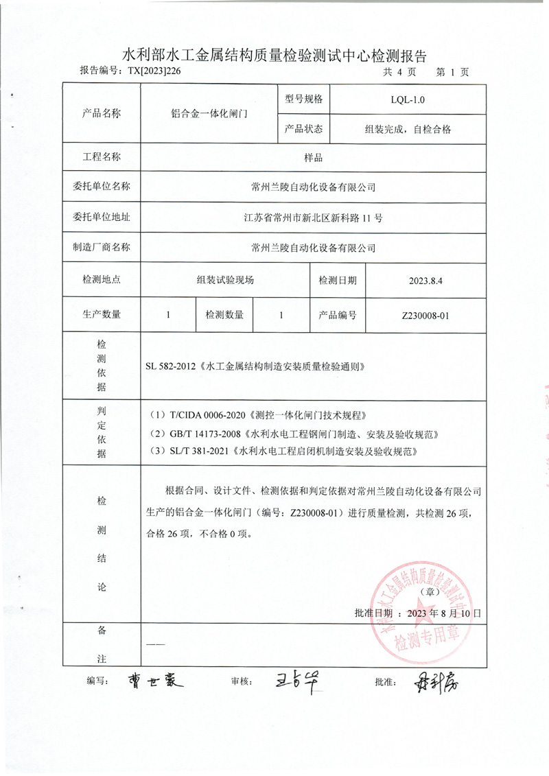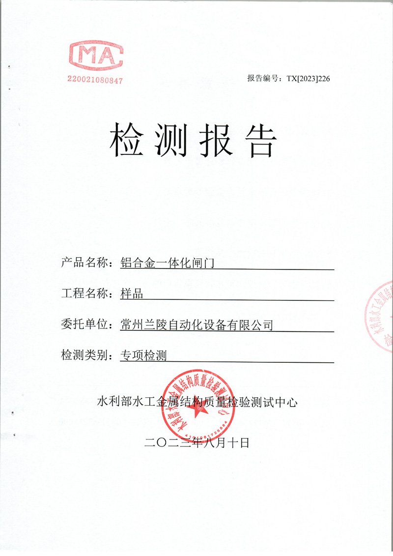 水利部水利金屬結構鋁合金一體化閘門檢測報告